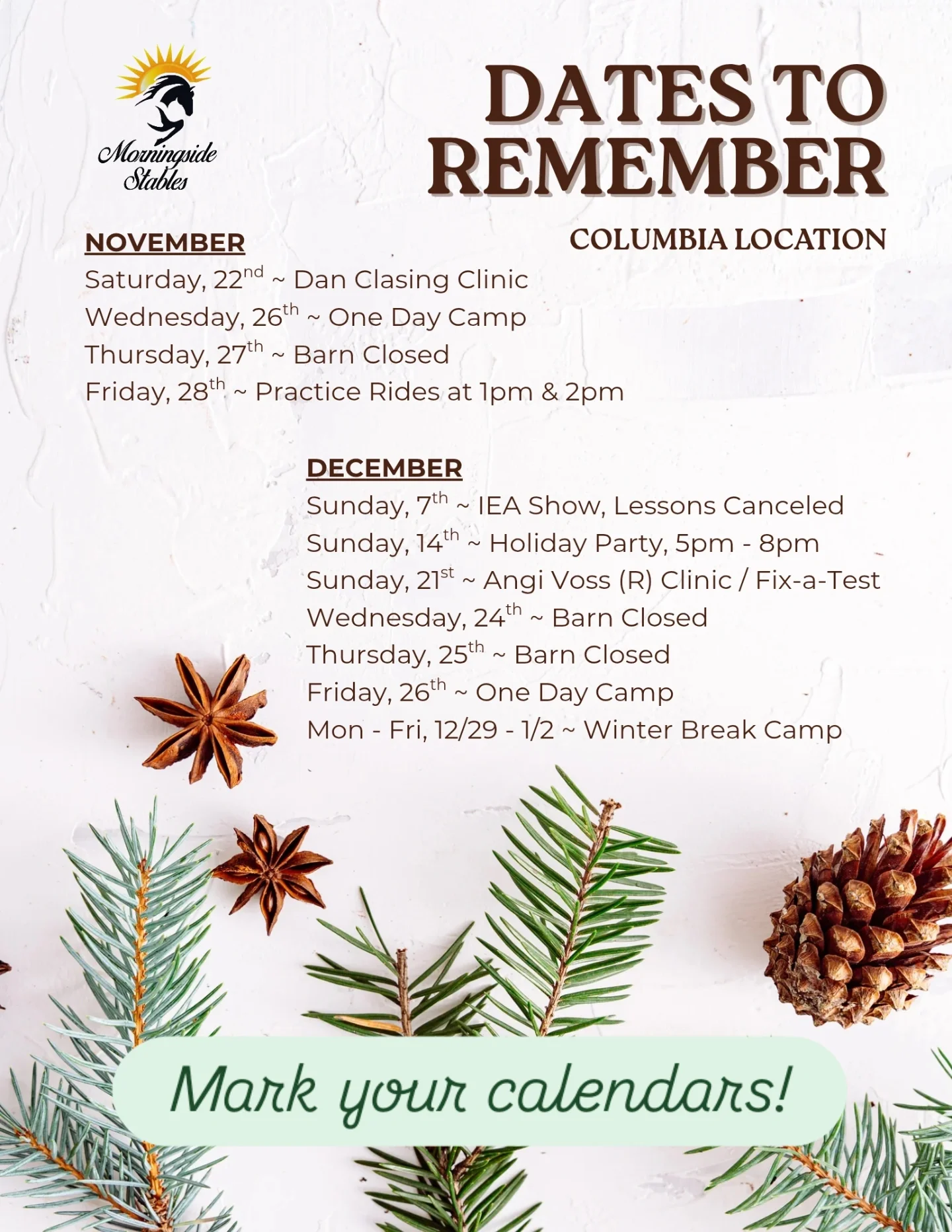 Morningside Stables offers several clinics at our Columbia Horse Center location. Competitors such at Lainey Ashker, Hillary Moore-Herbert, Robin Wyman, and other well respected clinicians in the area offer their expertise. Whether it is a “fix-it” test, equitation, hunter/jumper, dressage, or cross country, we offer the opportunity for our students to further their riding education.
